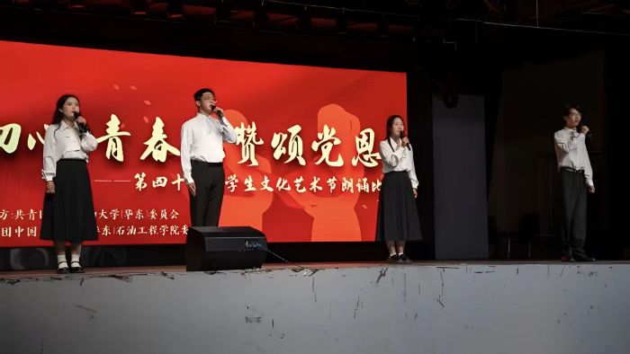 從教室排練到正式登臺,在石油工程學院“青春風采,油此綻放”2024級團支部風采大賽、石油工程學院“青春不息,后會油期”2025屆畢業(yè)晚會、第三屆全國重點中學班主任論壇等舞臺上,隊員們以飽含深情的聲音,以《永遠的鐵人》朗誦節(jié)目講述石油人勘探的艱辛、開采的堅守。讓臺下觀眾透過字句,觸摸石油精神的溫度。讓石油故事,先于實踐調(diào)研,在聲浪中播下傳承的種子。