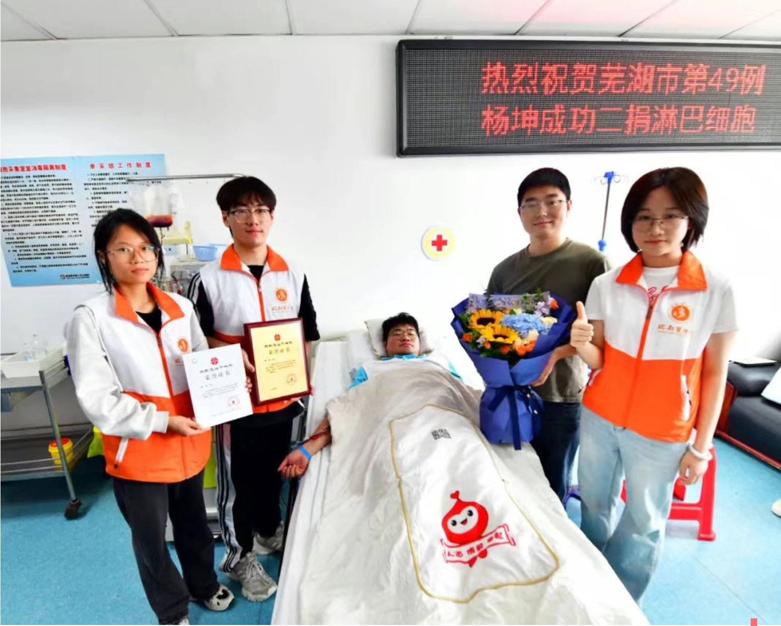 時(shí)間回到2024年5月,皖南醫(yī)學(xué)院“醫(yī)路相髓紅十字志愿服務(wù)隊(duì)”組織獻(xiàn)血車進(jìn)校園活動(dòng),現(xiàn)場222位獻(xiàn)血者中,有117位加入了中華骨髓庫。楊坤正是在那次活動(dòng)中采集血樣,成為了中華骨髓庫的一名志愿者。令人驚喜的是,僅僅9個(gè)月后他就配型成功。今年4月1日,他完成了第一次造血干細(xì)胞捐獻(xiàn),成為蕪湖市第44位造血干細(xì)胞捐獻(xiàn)者,救助了江蘇省一名血液病兒童。