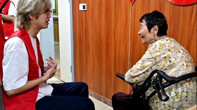 圖為志愿者陪伴老人聊天“禁毒亮劍青春行,防艾長(zhǎng)城眾志凝”禁毒防艾實(shí)踐團(tuán)攝