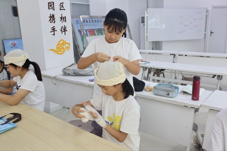 相較于首次課程的啟蒙引導(dǎo),本次包扎教學(xué)更注重技術(shù)的系統(tǒng)性與操作的精確性。授課者著重講解了環(huán)形、螺旋、螺旋反折、“8”字四種基礎(chǔ)繃帶包扎法,以及手部懸吊、頭部包扎兩種三角巾使用技巧。每一項技法的講解都條理清晰,從包扎部位的選擇到繃帶纏繞的力度,從三角巾的折疊方式到固定位置的確定,無不細(xì)致入微,確保孩子們能夠全面掌握其中的要點。