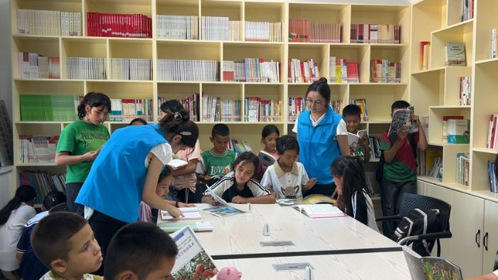 實踐隊隊員們帶著村里的孩子們圍坐在長桌旁,手里捧著書本輕聲朗讀。孩子們坐得筆直,小手指著書頁上的文字,偶爾遇到不認識的字便仰起頭提問,眼里滿是好奇。翻書的沙沙聲和清脆的朗讀聲在安靜的房間里交織,閱覽室浸著專注又溫暖的氣息。