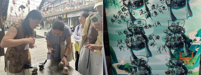 活動(dòng)現(xiàn)場(chǎng)人頭攢動(dòng),香氣四溢的臨渙燒餅、爽滑可口的淮北面皮吸引著人們的味蕾;精巧細(xì)膩的陳氏剪紙、色彩斑斕的花鳥(niǎo)字藝術(shù)令人嘆為觀止;韻味悠長(zhǎng)的花鼓戲唱腔和悠閑醇香的臨渙棒棒茶氛圍,更是讓同學(xué)們沉浸式體驗(yàn)了淮北地區(qū)深厚的歷史文化底蘊(yùn)和濃郁的地方生活氣息。在眾多精彩的非遺展示中,隊(duì)員們尤其對(duì)寓意吉祥、造型精美的楊氏香包產(chǎn)生了濃厚興趣,并與楊氏香包傳承人老師建立了聯(lián)系。