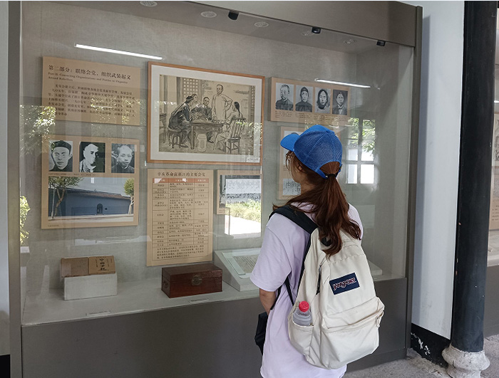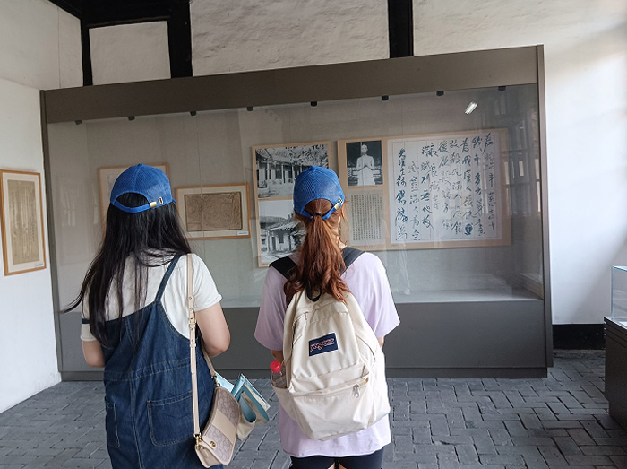 團(tuán)隊(duì)參觀了大通學(xué)堂的歷史遺跡和革命舊照,在學(xué)員寢室的玻璃窗上,團(tuán)隊(duì)成員注意到窗戶上貼滿人影的窗紙,是為復(fù)刻當(dāng)年學(xué)員早起訓(xùn)練場(chǎng)景裁剪布局而成。隨后,隊(duì)員們與值班負(fù)責(zé)人開(kāi)展交流,了解了大通學(xué)堂的建館歷程與領(lǐng)導(dǎo)關(guān)懷,并向工作人員咨詢陵園展館參觀人流量。工作人員表示,“大通學(xué)堂館內(nèi)資料豐富、雕像精美,但日均人流量較少,雖在后疫情時(shí)代人流有所增加,但參觀人群多以中小學(xué)組織為主”,仍需強(qiáng)化宣傳陣地建設(shè),營(yíng)造濃厚的紅色文化宣傳氛圍。參觀完畢后,團(tuán)隊(duì)進(jìn)行了場(chǎng)館清掃和宣傳講解,并對(duì)游客進(jìn)行隨機(jī)采訪,了解到秋瑾等革命烈士先進(jìn)事跡在當(dāng)?shù)厝巳褐械闹獣猿潭。游客表示,紹興人能夠普遍認(rèn)識(shí)并了解重點(diǎn)宣傳的部分革命烈士,但對(duì)烈士事跡掌握不夠,需要當(dāng)?shù)貙?duì)紅色故事開(kāi)展進(jìn)一步宣傳。