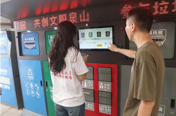 圖為企業(yè)負(fù)責(zé)人引導(dǎo)實(shí)踐團(tuán)成員體驗(yàn)智能垃圾分類垃圾亭的使用。大學(xué)生新聞網(wǎng)通訊員 韓麗婷 攝