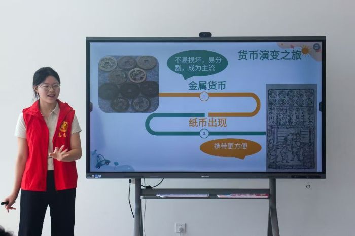 課程伊始,孩子們“古代貝殼當(dāng)錢,弄丟貝殼算丟錢嗎?”的提問,讓實(shí)踐隊(duì)明確以深入淺出方式傳遞財(cái)商知識(shí)。成員們從貨幣起源切入,手持貝殼教具講解:貝殼因稀有且易保存,最早被當(dāng)作貨幣使用。這時(shí),調(diào)皮小宇舉手提問“那我把家里的貝殼都找出來,能買好多玩具嗎?”,實(shí)踐隊(duì)成員趁熱打鐵,引導(dǎo)大家對(duì)比“古代貝殼”與“現(xiàn)代紙幣”,還以校園小賣部買零食為例解釋:“一塊巧克力賣3元,是用紙幣代替貝殼完成價(jià)值交換。”