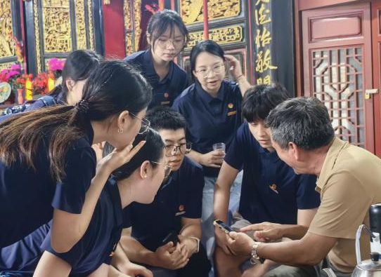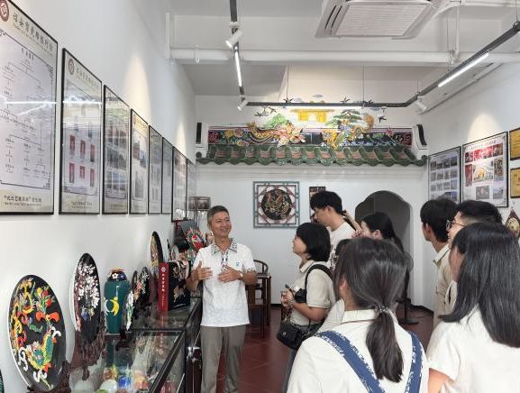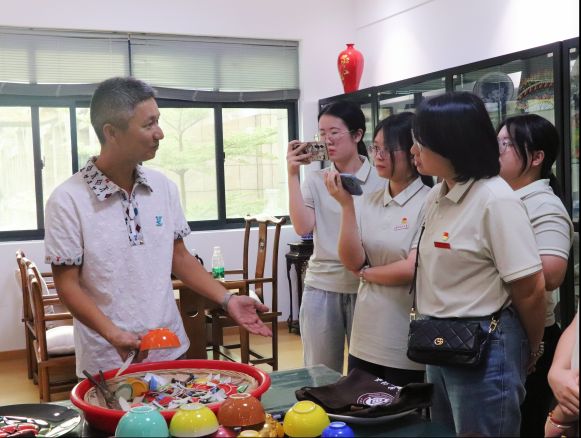 在剪瓷雕陳列館與沈氏大宗祠“饗保堂”,福建省省級剪瓷雕工藝(詔安)第五代傳承人沈錫仁與隊員們展開了一場傳統(tǒng)與現(xiàn)代的深入對話。陳列館內(nèi),沈老師不僅向隊員們解析剪瓷雕技藝的技術(shù)精髓,更分享了他將人工智能技術(shù)與傳統(tǒng)技藝融合的創(chuàng)新構(gòu)想,展現(xiàn)出非遺傳承人立足傳統(tǒng)、開拓創(chuàng)新的前瞻視野。實踐隊員小湯表示,“沈老師對藝術(shù)的熱忱,對傳統(tǒng)工藝傳承發(fā)展的深刻思考,讓我對非物質(zhì)文化遺產(chǎn)的保護(hù)與創(chuàng)新有了全新的認(rèn)識。”