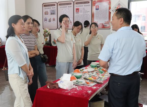 在詔安縣文化館,館長黃麗冬詳細(xì)介紹了“童蒙學(xué)堂”的設(shè)立背景與實踐路徑。該學(xué)堂以剪瓷雕、詔安童謠、燈謎等非物質(zhì)文化遺產(chǎn)為核心課程內(nèi)容,通過沉浸式、體驗式的教學(xué)方式,讓青少年在親身參與中感悟地方文化的獨特魅力。她強(qiáng)調(diào)“文化不是講出來的,而是做出來的”,剪瓷雕進(jìn)課堂在“做中學(xué)”的方式為其傳承延續(xù)注入新的生命力。隊員們認(rèn)真記錄下課堂設(shè)計與課程體系,為后續(xù)調(diào)研非遺教育推廣路徑積累了寶貴資料。