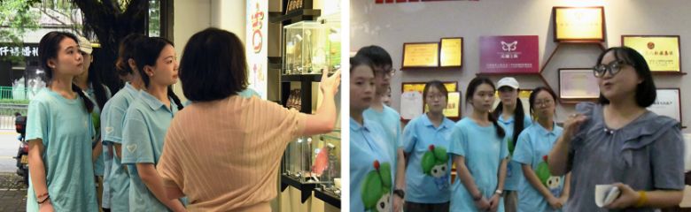 講解員賈穎帶領團隊成員參觀涪州結繩非遺工坊。據悉,該工坊創(chuàng)新實施“3+3”項目特色、四大品牌構筑結繩產業(yè)鏈、五環(huán)閉環(huán)運營模式等企業(yè)體系管理建設,致力于傳承結繩古法技藝,致富一個家庭,造福一方經濟。