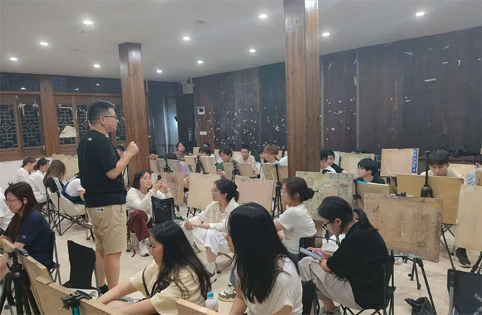 為捕捉晨光中古建筑的獨特韻味,不少隊員早早便在敬愛堂、追慕堂等標志性建筑周邊選好了寫生位置。清晨的陽光穿過馬頭墻縫隙,在斑駁的粉墻上投下錯落的光影,墻面因經年雨水沖刷與青苔覆蓋,呈現(xiàn)出白、灰、淡綠交織的復雜色調。隊員們支起畫架,從確定建筑整體比例入手,細致雕琢斗拱、瓦當?shù)葮嫾募y路,在調色盤上反復調試顏料,力求還原墻面的真實質感與光影層次,通過反復嘗試與調整,逐步掌握了古建筑色彩的表現(xiàn)技巧。