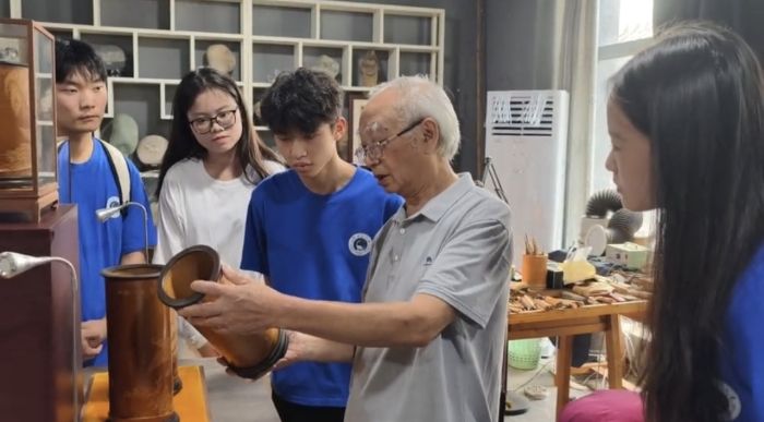 當(dāng)實(shí)踐觸及"傳承如何可持續(xù)"的深層思考時,非遺傳承人的經(jīng)驗為團(tuán)隊提供了答案。拜訪國家級竹簧傳承人何華一先生,其"非遺要活在當(dāng)下"的理念與實(shí)踐極具啟示:他將竹簧從傳統(tǒng)擺件拓展至現(xiàn)代壁畫、家居裝飾,用設(shè)計創(chuàng)新讓古老技藝融入生活;其女探索的"非遺 + 文創(chuàng)"、"非遺 + 研學(xué)"路徑,則展現(xiàn)了傳統(tǒng)與市場結(jié)合的可能。何家父女的實(shí)踐印證了傳承需以創(chuàng)新為橋,讓文化在時代語境中找到新坐標(biāo),為團(tuán)隊的傳承思考打開了新視野。