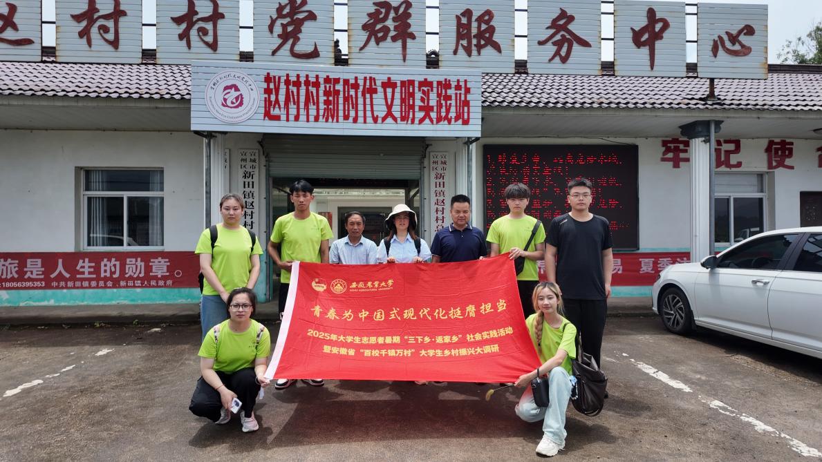 調研結束后,團隊在趙村村黨群服務中心門前,與當?shù)馗刹亢嫌傲裟睿涗浵逻@段探索鄉(xiāng)村振興的經歷。