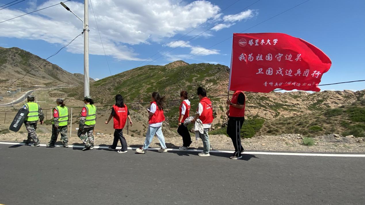 圖為實(shí)踐團(tuán)成員在八十一團(tuán)塔拉夏溝邊境警務(wù)站再走戍邊路 (攝/李鑫)
