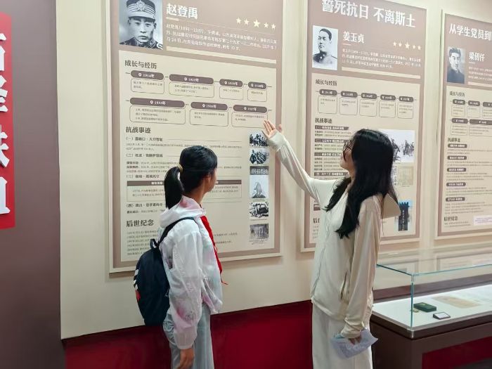 圖為實(shí)踐團(tuán)成員向?qū)W生介紹抗戰(zhàn)英雄人物 錢寧盈 供圖