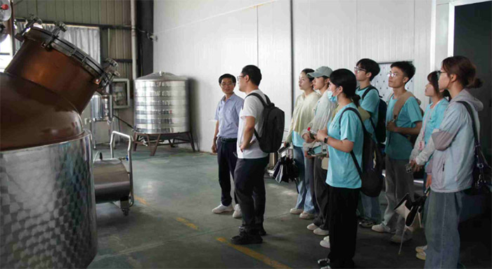 在汪百根廠長與王宇老師的帶領下,團隊走進懷寧藍莓科技小院,首先參觀了全自動蒸餾車間,了解"掐頭去尾"提純工藝如何精準去除甲醇等有害物質,并通過玫瑰花增香技術提升產品風味,然后,陳釀方面創(chuàng)新采用橡木板材,在保證酒體風味的同時實現成本控制,在藍莓干加工中,糖分添加工藝有效保持果形與口感,展現了食品加工的精細把控。在產品展示區(qū),NFC藍莓果汁的高花青素含量尤為突出。這得益于創(chuàng)新應用的燙漂技術,通過雙果膠酶協同作用大幅提升營養(yǎng)價值。汪廠長表示,將繼續(xù)深化與高校合作,重點攻關藍莓凍干破裂等技術難題,推動產業(yè)向高附加值方向發(fā)展。此次實踐讓隊員們切身感受到"科技小院"模式如何通過產學研融合,為鄉(xiāng)村振興注入創(chuàng)新動能。