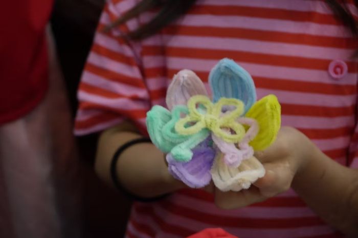 在扭扭棒活動環(huán)節(jié),色彩繽紛的扭扭棒成了孩子們手中的“魔法道具”。他們的小手靈活舞動,時而彎曲,時而纏繞,專注神情仿佛在施展神奇魔法。每一個作品都獨一無二,充滿天馬行空的創(chuàng)意。孩子們在創(chuàng)作過程中,不僅鍛煉了動手能力,更激發(fā)了無限想象力。志愿者們積極融入其中,與孩子們并肩作戰(zhàn)。當遇到復(fù)雜操作,孩子們手足無措時,志愿者們及時伸出援手,耐心輔助他們完成。一件件“大作”順利完成后,孩子和志愿者臉上都洋溢著滿滿的成就感,孩子們更是擁有了屬于自己的心儀作品,這份喜悅在空氣中久久彌漫。