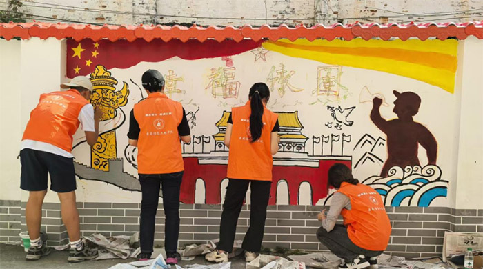 在墻繪過(guò)程中,“墨彩永固”突擊隊(duì)分工明確,有人勾線,有人調(diào)色,有人補(bǔ)細(xì)節(jié)。烈日當(dāng)空,汗?jié)褚律廊圆煌9P;突降大雨,趕緊護(hù)畫,雨停后立刻修補(bǔ)。從生澀到熟練,技法在堅(jiān)持中提升,最終讓鄉(xiāng)村墻面煥發(fā)光彩,成了一道亮麗風(fēng)景。