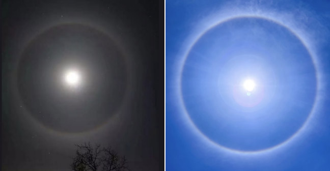 “日圍箍”(日暈)——太陽周圍的光暈(日暈),同樣由日光穿透卷層云冰晶折射產(chǎn)生。