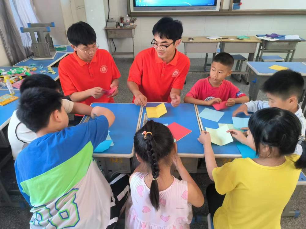 圖為蒲公英支教社會(huì)實(shí)踐團(tuán)隊(duì)成員教孩子們折紙。