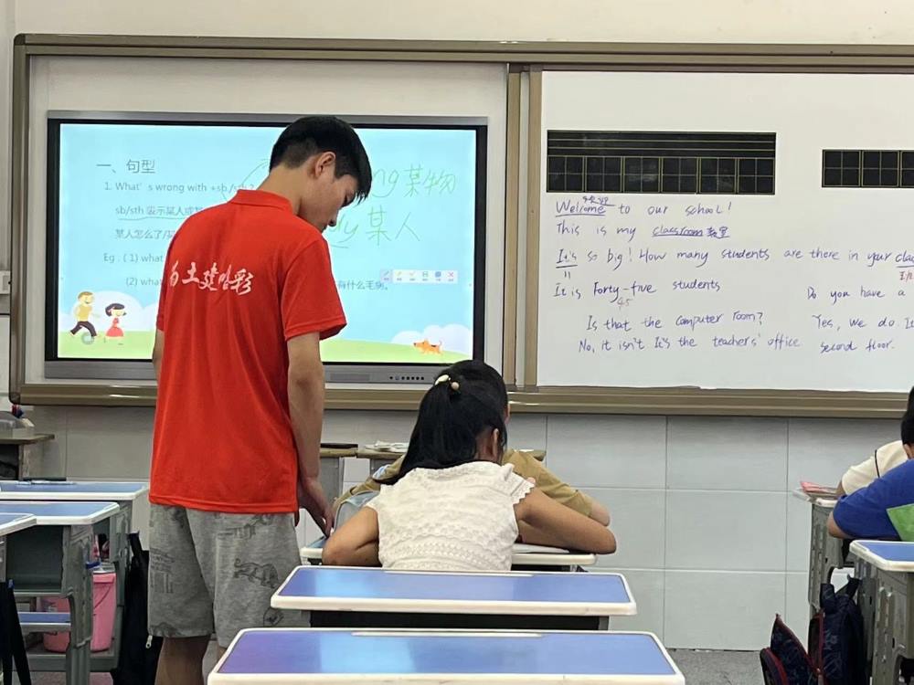 圖為蒲公英支教社會(huì)實(shí)踐團(tuán)隊(duì)成員給孩子上英語課。
