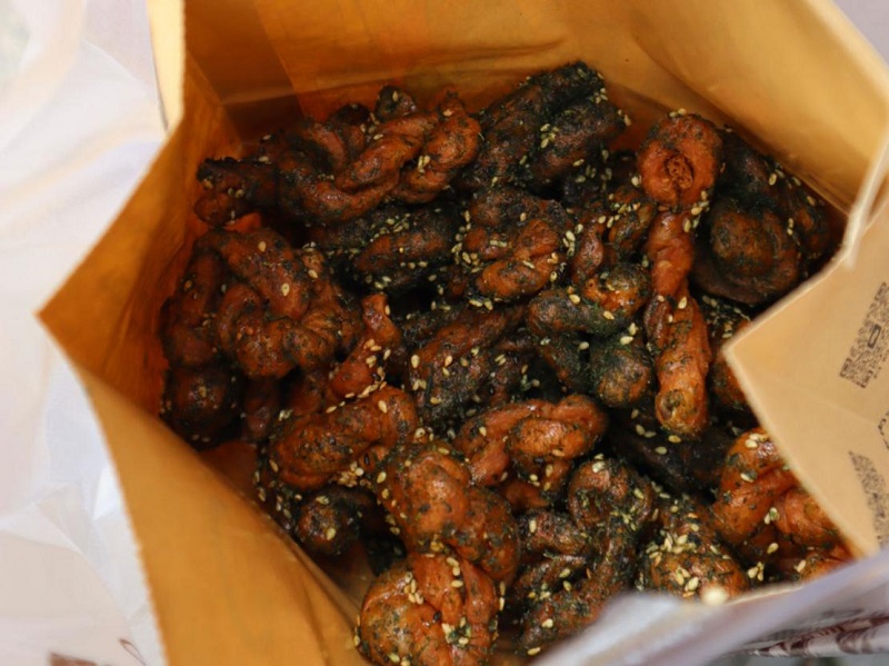 圖為團隊成員購買品嘗店內(nèi)創(chuàng)新的海苔味油贊子。