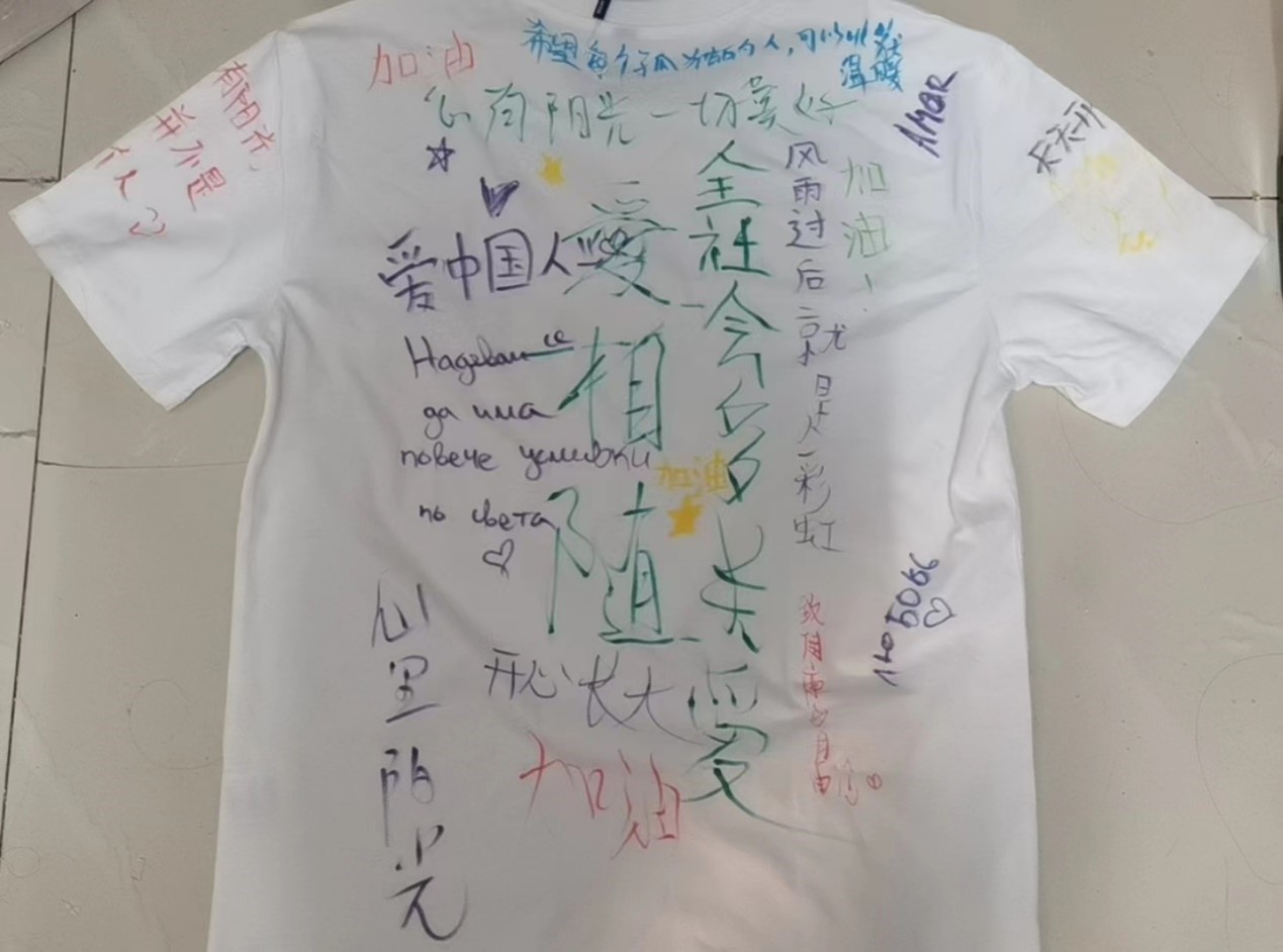 除了義賣,一位身穿白色文化衫的隊(duì)員也手持畫筆穿入人群,每一次駐足都在渴求愛(ài)的回應(yīng):“請(qǐng)您在空白處寫下想對(duì)孤獨(dú)癥孩子們說(shuō)的話”。那個(gè)午后,五彩的筆跡由中文、英文、俄文和葡萄牙文交織而成,繪成一片綿軟的愛(ài)意。語(yǔ)言不通,心意相通。前人溫暖的話語(yǔ),也給了后人提筆鼓勵(lì)的勇氣