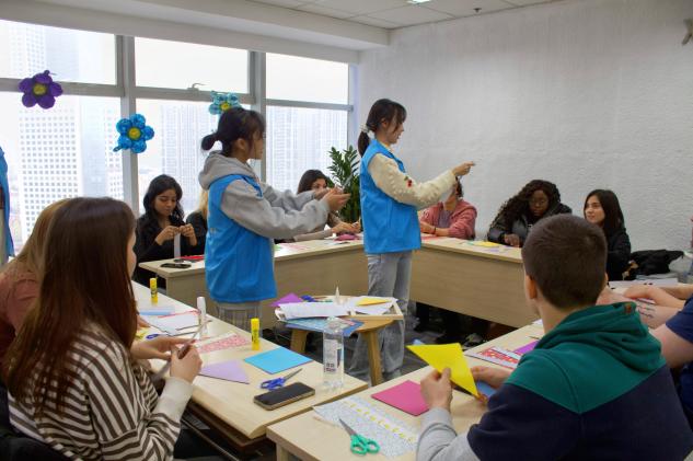 圖為實(shí)踐隊(duì)員向外國(guó)友人進(jìn)行漢服折紙的教學(xué) 通訊員 田和洳 供圖