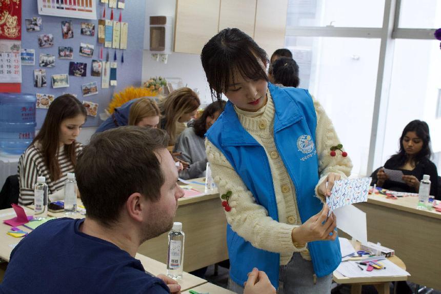 圖為實(shí)踐隊(duì)員正在向新環(huán)球漢語學(xué)員演示漢服折紙步驟。中國青年網(wǎng)通訊員 王書陽 供圖