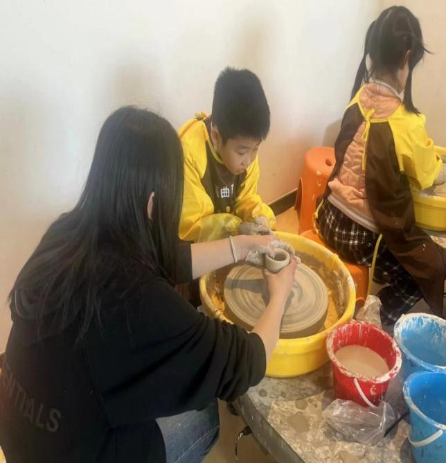 圖為實(shí)踐隊(duì)隊(duì)員協(xié)助小朋友制陶 徐寧 供圖
