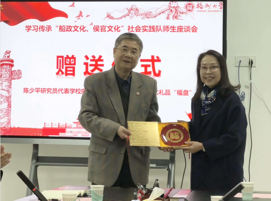 座談會上,福州大學(xué)關(guān)工委常務(wù)副主任陳少平研究員代表學(xué)校向沈園女士贈送福州大學(xué)文化禮品“福盤”。