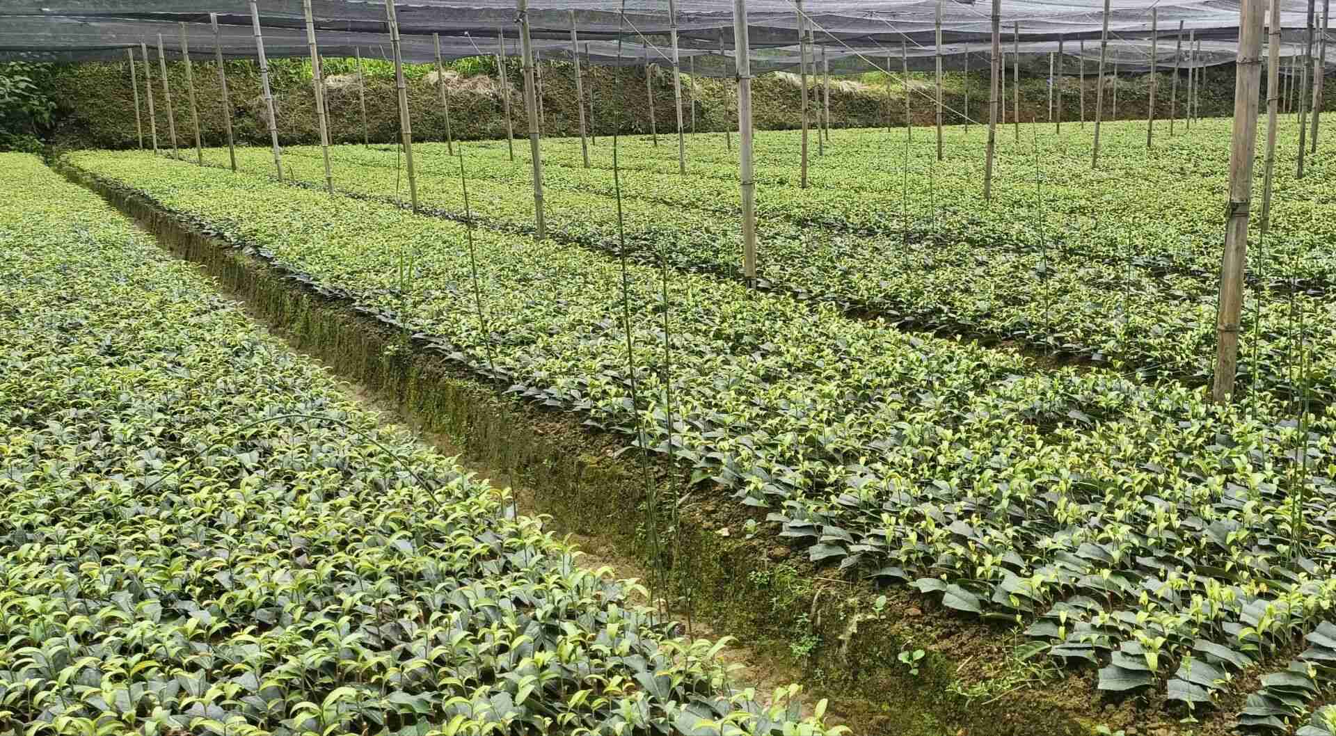 1月11日上午,團隊成員前往三江侗族自治縣八江鎮(zhèn)布央村美地屯茶苗培育基地,了解三江茶的育苗工作。在這里,團隊了解到茶樹的生長周期主要分為幼苗期、幼齡期、成年期、衰老期四個時期。而從茶苗到可以移植的茶樹大概需要3~4個月的生長時間。據(jù)負責(zé)人的講解,三江本地茶育苗,有整地、挖溝、蓋地膜、遮陽網(wǎng)、購本地茶穗條、剪有芽的短枝條、稱重、扦插、淋水等一系列環(huán)節(jié)。這些環(huán)節(jié)對于茶苗的生長具有很大的幫助作用,為提高產(chǎn)量做出了重要貢獻。下午,團隊成員來到布央仙人山茶園,目前茶園面積3600余畝,連片的“仙人山”千畝生態(tài)茶園作為三江縣侗茶產(chǎn)業(yè)的發(fā)源地,有“千畝茶園好風(fēng)光,濃郁茶香飄四方”的美稱。
