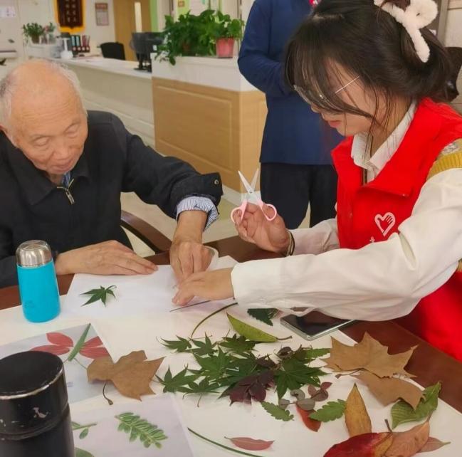 圖為實踐隊員與康養(yǎng)中心老人一起完成樹葉標(biāo)本的制作