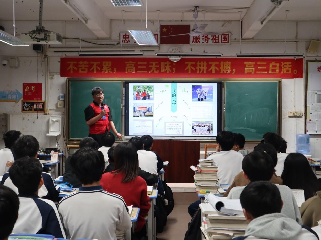 團(tuán)隊(duì)成員抓住機(jī)會,積極與校領(lǐng)導(dǎo)溝通,切實(shí)走進(jìn)高中校園,站上講臺,把廣東石油化工學(xué)院介紹給在座的學(xué)弟學(xué)妹。實(shí)踐隊(duì)成員不僅引導(dǎo)他們要用專業(yè)、學(xué)校、城市三維度多領(lǐng)域的分析確定自己的喜好,還圍繞教育部新一輪的政策情況與廣東石油化工學(xué)院具體情況進(jìn)行解讀,向他們展示了一個(gè)立體全面、朝氣蓬勃的廣東石油化工學(xué)院。