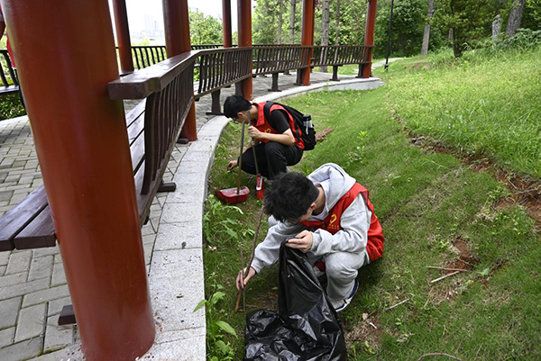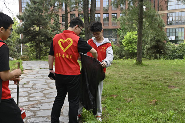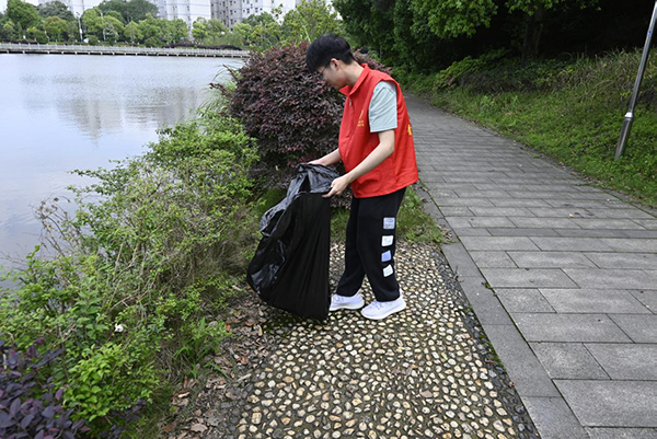 圖為志愿者收集著清潔來(lái)的垃圾,將其全部帶走讓松園一塵不染。