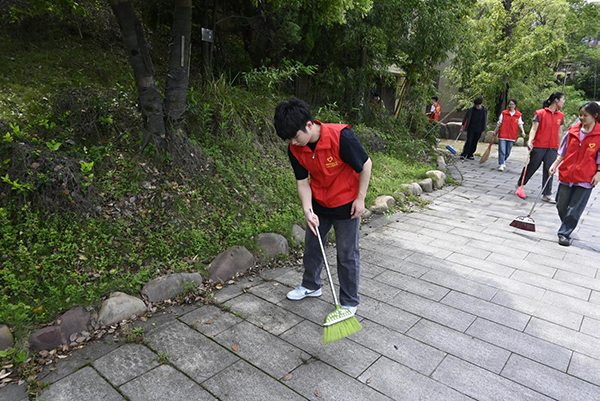 圖為志愿者認(rèn)真清掃涼亭邊的垃圾,為營(yíng)造一個(gè)良好的環(huán)境做出貢獻(xiàn)。