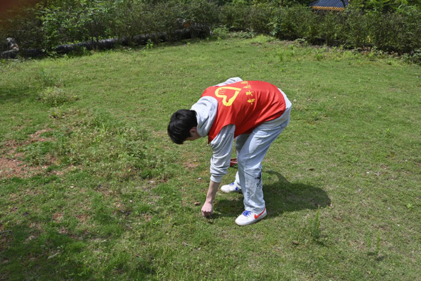 圖為志愿者撿拾草地的落葉和碎屑,認(rèn)真清潔著草地上的每一個(gè)角落。