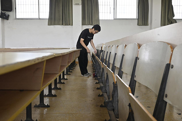 圖為志愿者打掃第五教學(xué)樓教室衛(wèi)生,確保教室整潔的環(huán)境。