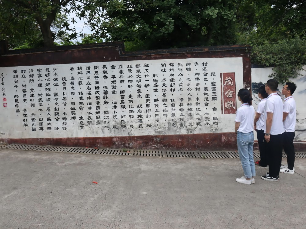 一地承古韻,一墻載文明。傳承團(tuán)成員在陳家壩茂合村黨支部書記牟奇富的帶領(lǐng)下,參觀學(xué)習(xí)了提筆在村墻上的《茂合賦》《相約天街》等文學(xué)作品,這些作品細(xì)膩描繪了茂合村獨(dú)有的風(fēng)土文化,讓傳統(tǒng)文化結(jié)合當(dāng)?shù)貙?shí)際在新時(shí)代煥發(fā)出新的活力。鄉(xiāng)村的振興離不開(kāi)文化的支撐,當(dāng)?shù)匾浴睹腺x》文學(xué)作品為載體,利用村里宣傳欄、文化墻等媒介形式,將各項(xiàng)政策、傳統(tǒng)美德、村規(guī)民約等有機(jī)結(jié)合,讓茂合村村民在日常生活中接受文明的熏陶,踐行鄉(xiāng)村文明新風(fēng)。