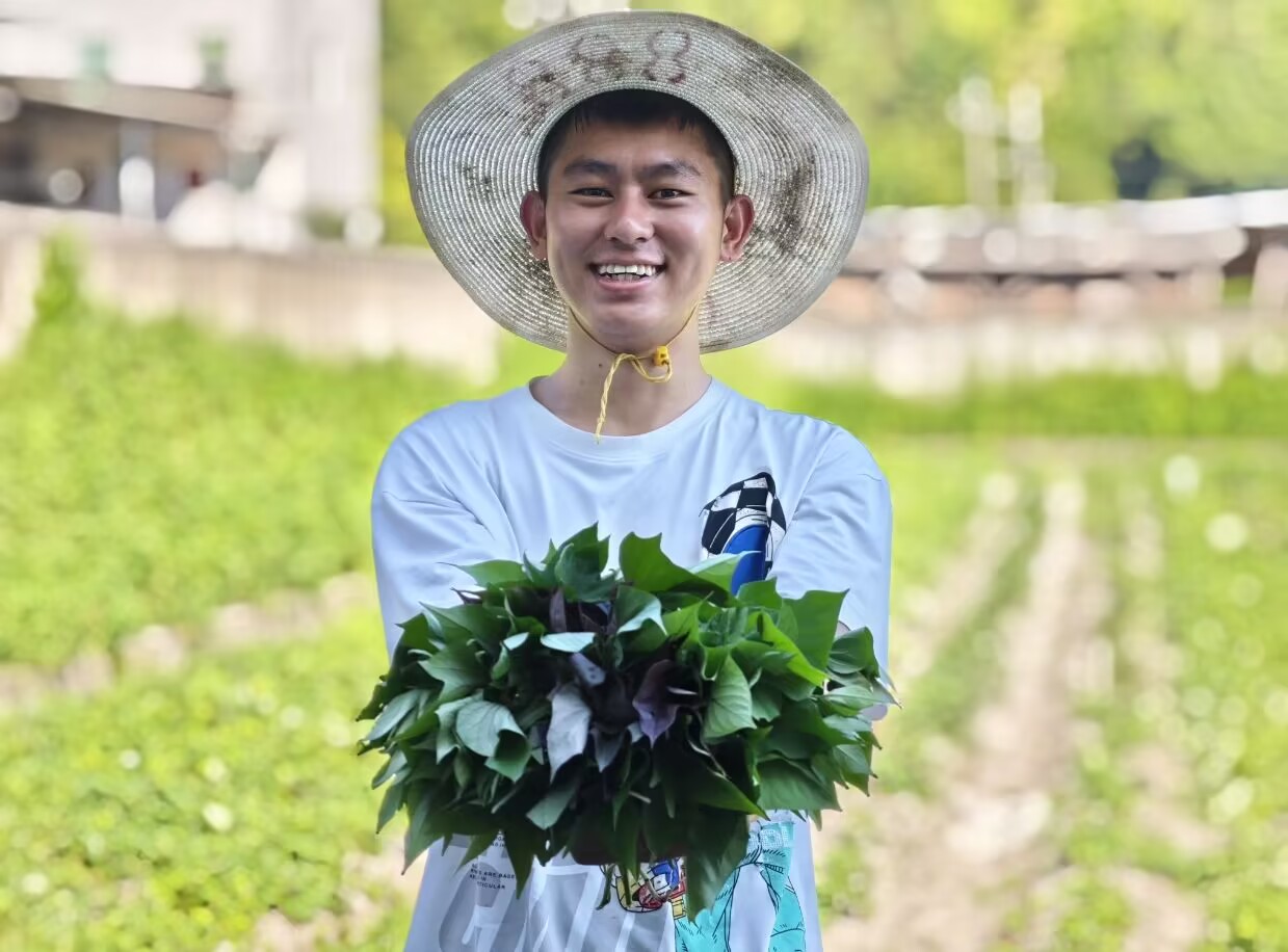 圖為實(shí)踐隊(duì)隊(duì)員余鵬波手捧甘薯苗 覃曉暉攝