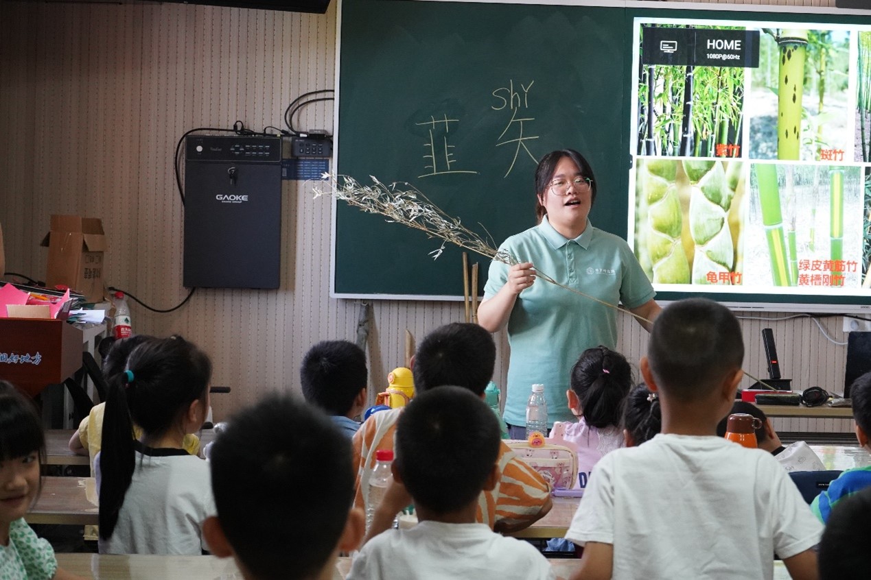 竹科普課上,實踐團成員還向孩子們展示了浙農(nóng)林大竹研院林新春教授團隊成員創(chuàng)制的轉(zhuǎn)