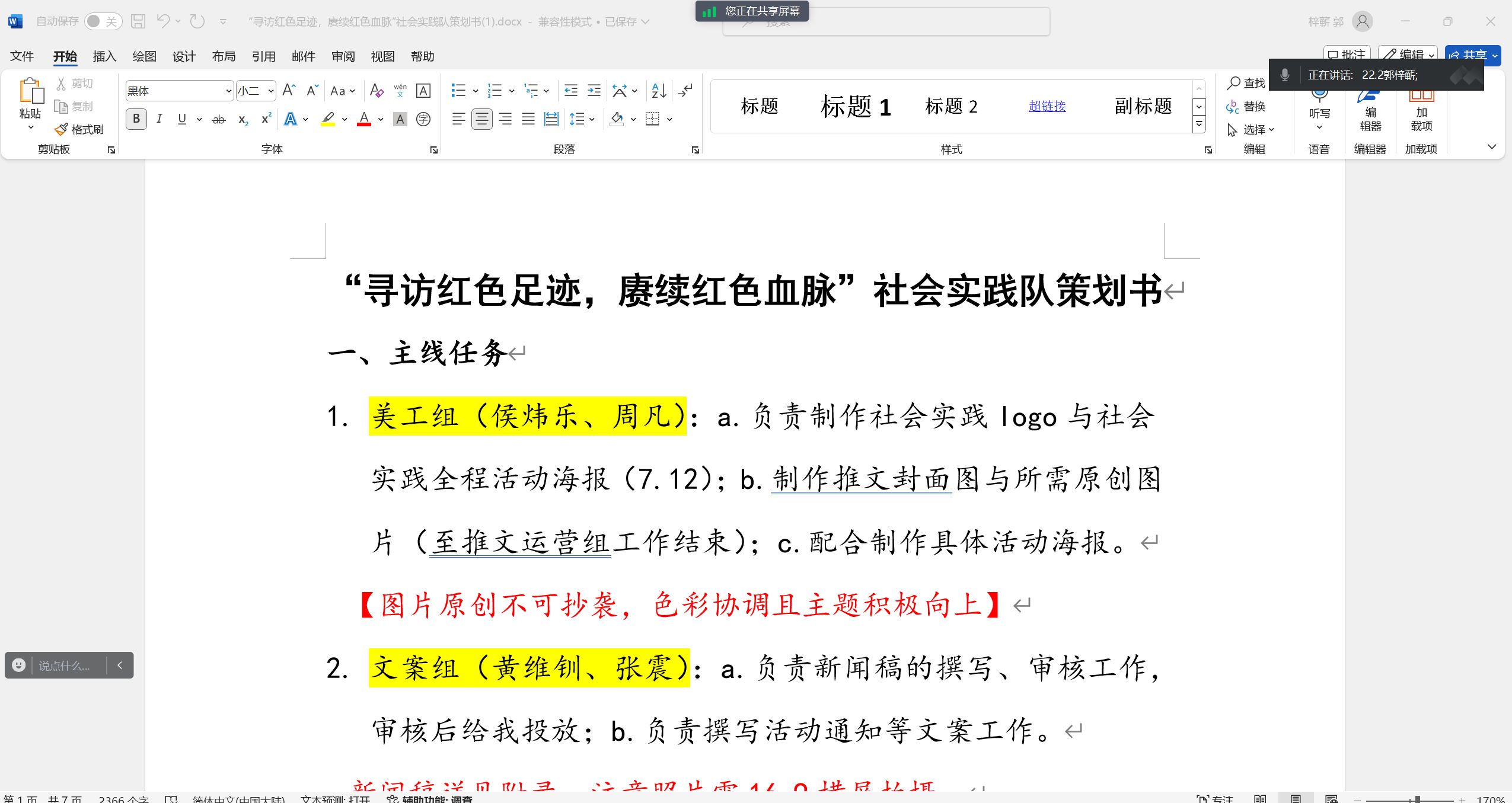 緊接著,郭梓蘄向各位成員講解了本次社會實踐的時間與流程。本次社會實踐將于7月15日至8月15日以線上線下相結(jié)合的方式開展。團隊將采取社區(qū)宣講、紅色遺址走訪調(diào)查、電臺錄制等多種形式宣傳紅色精神,傳播革命文化,了解社會實踐背景與現(xiàn)狀,并希望能引起社會各界廣泛關(guān)注。同時,郭梓蘄強調(diào)了社會實踐宣傳的重要性,指出社會實踐不僅需要做出來,還需要讓大家看得到。為此團隊采取了推文、新聞稿、媒體平臺等形式進行宣傳,積極探索宣傳社會實踐的渠道。