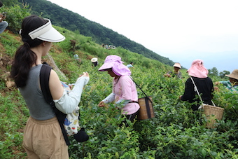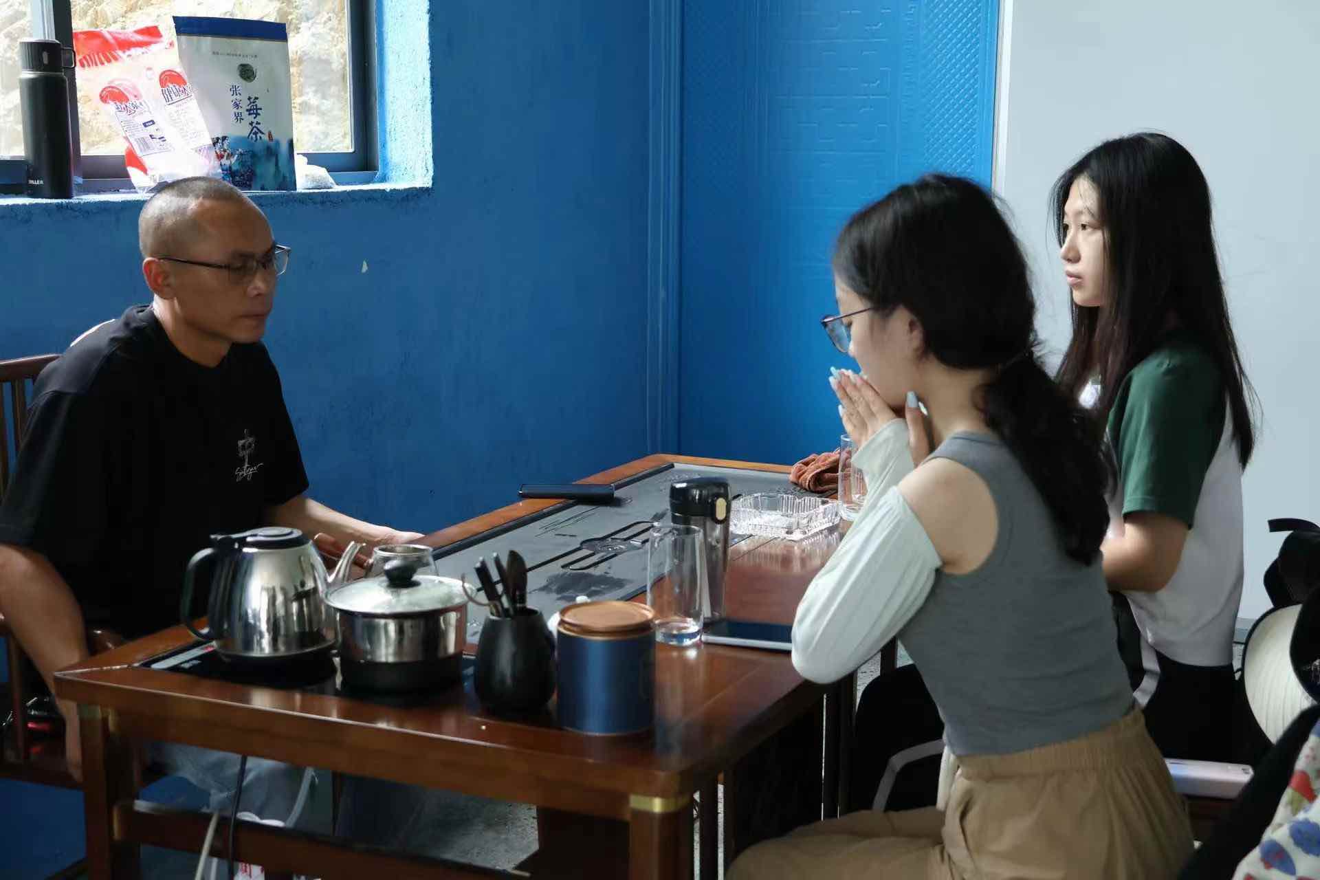 丁先春帶領(lǐng)服務(wù)隊成員來到福耳界莓茶基地,進行莓茶采摘加工過程的參觀。實地參觀過程中,宣傳組成員對莓茶的采摘及加工過程進行了拍攝,調(diào)研組成員對采茶人員及車間加工人員進行了提問并記錄在冊。參觀結(jié)束后,調(diào)研組成員圍繞莓茶的生產(chǎn)、宣傳、銷售、加工方面與丁先春進行交流,獲得了較為詳細(xì)的相關(guān)信息。
