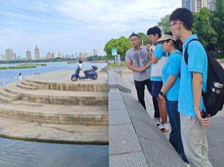 此圖為實(shí)踐團(tuán)成員與宜興市公用環(huán)保集團(tuán)李總參觀團(tuán)氿風(fēng)景區(qū)
