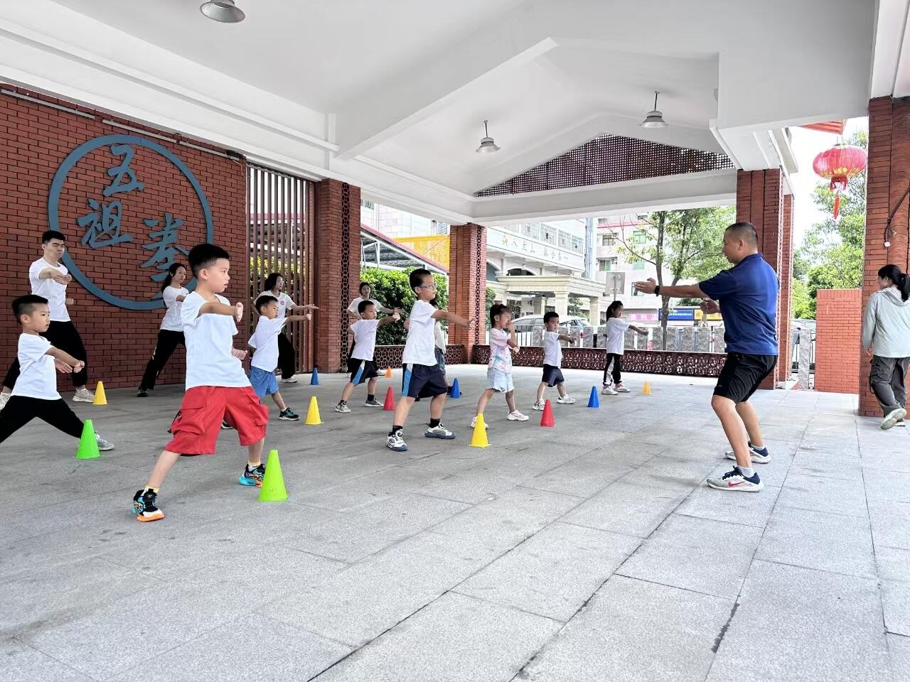 圖為實踐隊員們與夏令營學(xué)生共同學(xué)習(xí)新垵五祖拳 施昕怡攝
