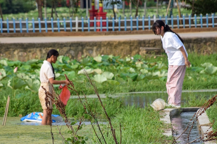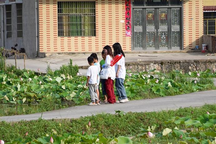 志愿團(tuán)成員喻婉瑩對(duì)在農(nóng)田勞作的村民進(jìn)行采訪,他們說道;“這片農(nóng)田今年是第一年種荷花,荷花長(zhǎng)勢(shì)與去年相比略差,但是今年田里的魚明顯增加,希望明年荷花和魚能長(zhǎng)得更好,我們也歡迎來自各地的人們到金興來旅游。”