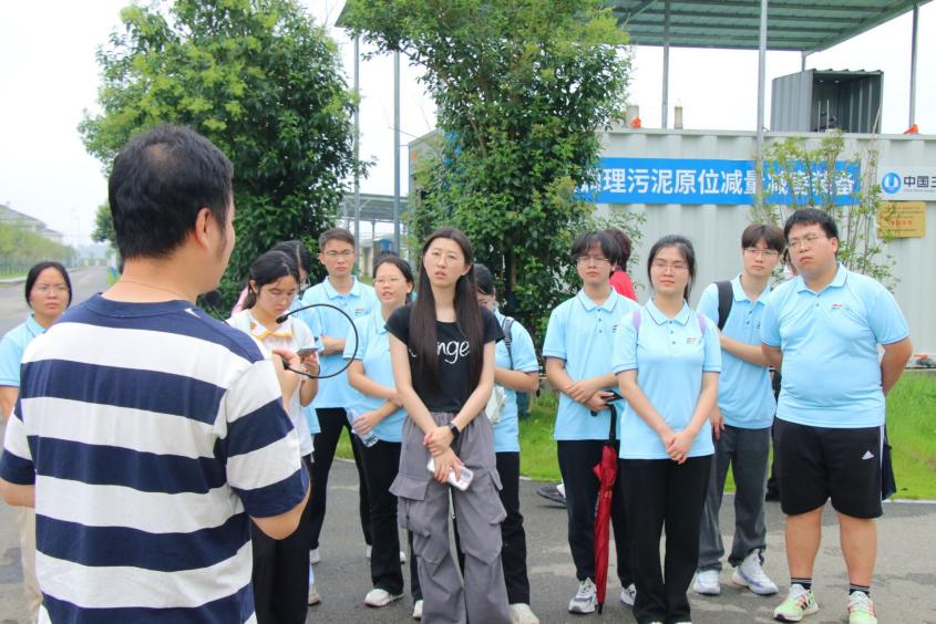 圖為講解員給實踐團成員講解臭氧調(diào)理污泥設(shè)備的操作流程(通訊員 鄧以諾 攝)