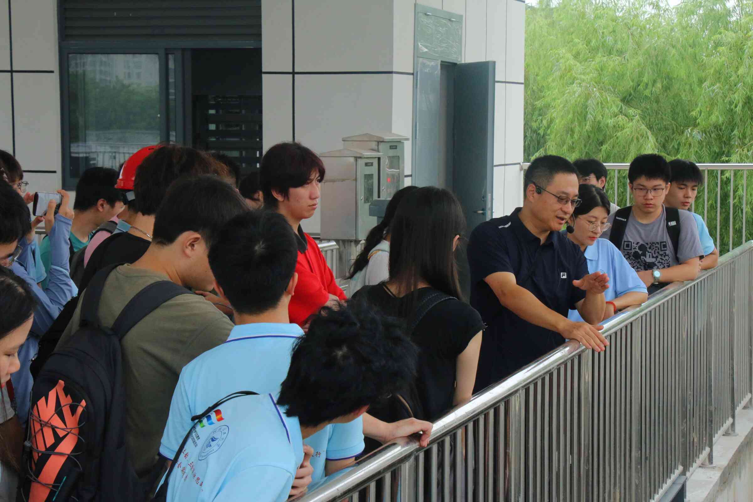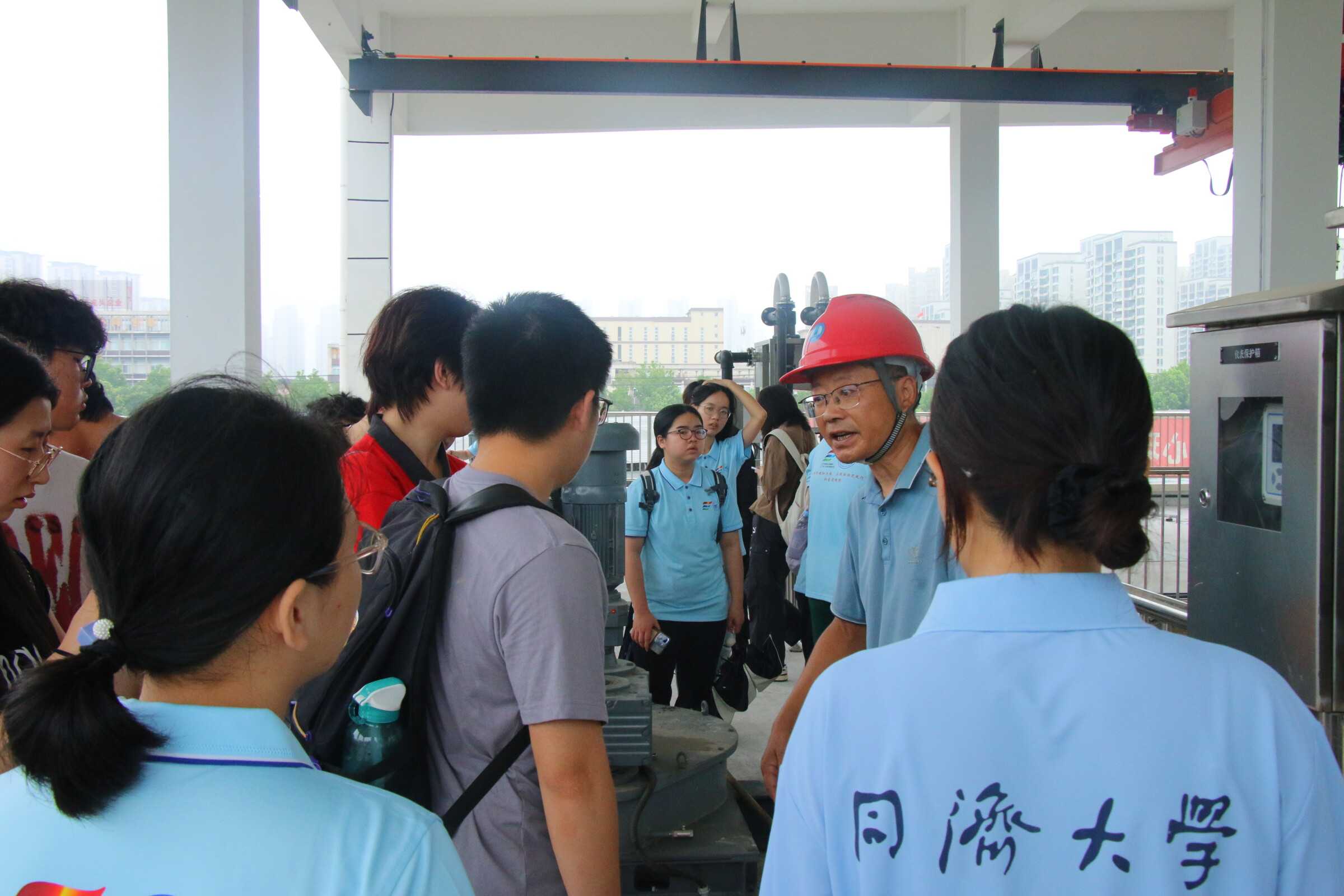圖為同濟(jì)大學(xué)董濱教授(左二)向同學(xué)們講解二沉池中刮泥機(jī)的工作原理。通訊員 鄧以諾 攝