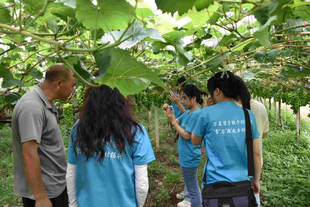 團隊師生一行人來到湯溝鎮(zhèn)江廠村為民服務中心,見到了即將上堤防汛的駐村干部胡小燕。胡小燕帶領團隊成員參觀了東滿葡萄莊園,農(nóng)戶陳東滿介紹了今年江廠村葡萄生產(chǎn)與種植情況。胡小燕向團隊介紹,江廠村的農(nóng)產(chǎn)品種植業(yè)作為本村特色產(chǎn)業(yè),已經(jīng)形成了葡萄、草莓、梨及觀賞草坪等多元化種植結(jié)構,共有葡萄園約100畝,草莓園約35畝,草坪種植更是達到了1380畝的壯觀規(guī)模,這些產(chǎn)業(yè)不僅豐富了市場產(chǎn)品供應,更是顯著提高了村民收入,她也深刻感受到,特色產(chǎn)業(yè)的發(fā)展是鄉(xiāng)村振興的重要動力。通過采訪了解到,去年胡小燕和家人還在湯溝鎮(zhèn)上自主創(chuàng)業(yè),開了一家水果零食店,采取先進的水果保鮮與陳列技術,為村鎮(zhèn)居民提供了更加舒適的消費體驗,同時也提高了家庭收入,為江廠村種植戶的農(nóng)產(chǎn)品提供了穩(wěn)定銷路。胡小燕2009年便回到家鄉(xiāng),成為駐村扶貧專項干部后更是全身心投入到鄉(xiāng)村振興的一線工作中。2020年以來,江廠村多次被評為“全縣先進基層黨組織”、“巾幗建功先進集體”、“樅陽縣文明村鎮(zhèn)”。胡小燕表示,江廠村的發(fā)展是全村人共同努力的結(jié)果,“村子富起來,家鄉(xiāng)就好起來。相信以后會有越來越多的年輕人回到這里,跟我們一道建設更美的‘新農(nóng)村’!”