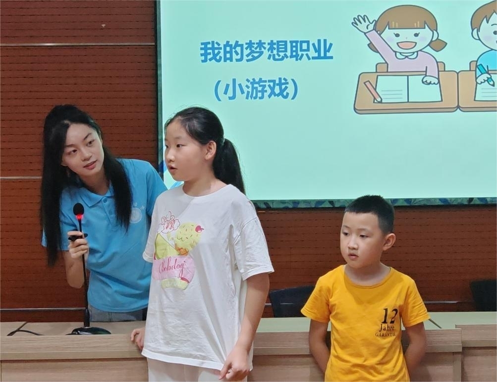 活動(dòng)伊始,志愿者們簡(jiǎn)明扼要地向小朋友們介紹了課堂的主要內(nèi)容和大致流程。小朋友們?cè)谥驹刚邆兊闹笇?dǎo)下,認(rèn)真準(zhǔn)備并完成了公眾演講。臺(tái)上的小朋友們個(gè)個(gè)神采飛揚(yáng),以稚嫩的童聲清晰地表達(dá)著自己的看法,積極展現(xiàn)自我風(fēng)采。為了讓小朋友們懷揣夢(mèng)想、勇敢追夢(mèng),志愿者們精心組織并引導(dǎo)小朋友們分組開展了“我來(lái)演示你來(lái)猜”的職業(yè)競(jìng)猜游戲。小朋友們輪流上前,生動(dòng)地表演自己夢(mèng)想中的職業(yè),而組內(nèi)其他小朋友則根據(jù)他們的表演來(lái)猜測(cè)職業(yè)。令人驚喜的是,小朋友們的職業(yè)理想已不再拘泥于“科學(xué)家”、“警察”這類神圣的職業(yè),他們將環(huán)衛(wèi)工人稱作“城市美化師”、將“外賣員”稱作“神奇的美食魔術(shù)師”。小朋友們關(guān)注更多平凡的職業(yè),尊重勞動(dòng),展現(xiàn)了新時(shí)代少年兒童的嶄新風(fēng)貌,讓志愿者們也深受教育和啟發(fā)。