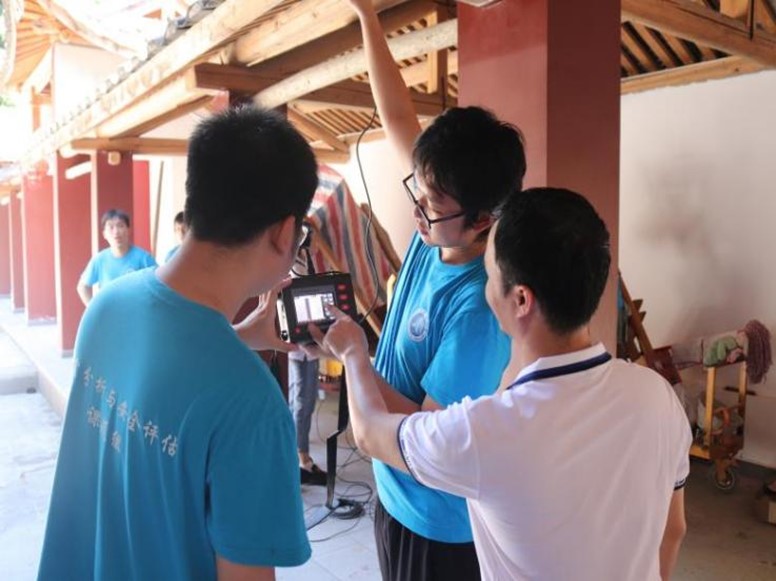 在專業(yè)老師的指導(dǎo)下,對神農(nóng)廟進(jìn)行了詳盡的房屋安全狀況評估,利用全站儀對房屋傾斜度測量以評估整體穩(wěn)定性,采用裂縫測寬儀和聲發(fā)射儀檢測裂縫寬和深度以量化結(jié)構(gòu)損傷程度,并通過回彈儀評估混凝土抗壓強度,對神農(nóng)廟的墻體、梁柱、屋頂?shù)汝P(guān)鍵位置進(jìn)行了細(xì)致入微的檢測。