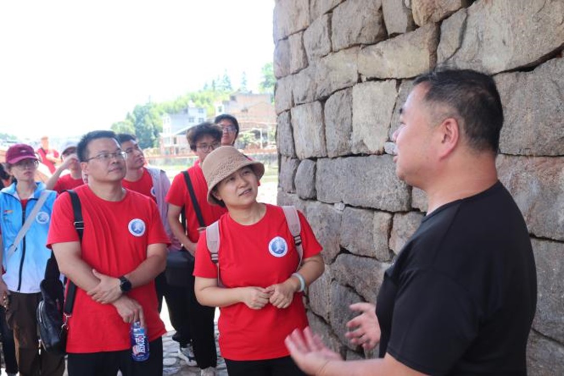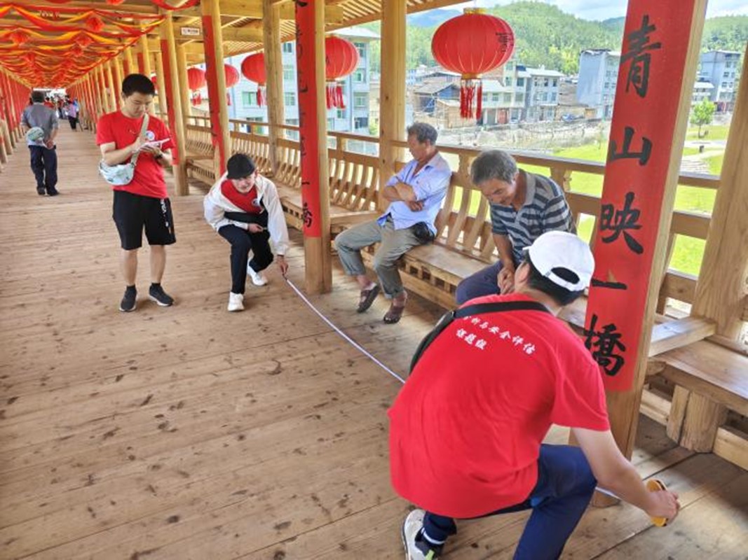 傳承人黃閩輝以其豐富的專業(yè)知識和生動的語言,將這座古老建筑的故事娓娓道來。萬安橋,又稱龍江公濟橋、彩虹橋,始建于北宋元祐五年(1090年),橋長98.2米,寬4.7米,是現(xiàn)存全國最長的木拱廊橋。萬安橋曾于2022年失火,后得以重建。歷史上,萬安橋經(jīng)過了三次焚毀,也經(jīng)過三次重修及多次維修。萬安橋采用中國木拱廊橋營造技術,工藝精湛。其獨特的木拱結構由三節(jié)苗與五節(jié)苗貫穿成一個曲形整體,輔以其他構件,以編、撐、頂、拉、別、靠、插、壓等力學原理為支撐,成功解決了大幅度拱跨受力難題。這種結構在世界橋梁史上具有重要地位,被譽為“我國古代橋梁歷史研究的‘活化石’”,早在2012年就入選了中國世界文化遺產(chǎn)預備名單。萬安橋不僅是當?shù)厝嗣窠煌ㄒ郎系闹匾O施,也是當?shù)厝嗣窬裎幕畹闹匾d體。橋上的楹聯(lián)、碑刻等文化遺存記錄了橋梁的建造歷程和捐資者的善舉,具有深厚的文化內(nèi)涵和歷史意義。團隊成員們聽得津津有味,不時發(fā)出陣陣贊嘆。他們紛紛表示,這次實地學習不僅讓他們對廊橋有了更加深入的了解,也讓他們對中華文化遺產(chǎn)有了更加深厚的感情,黃家一家三代曾數(shù)次參與修繕萬安橋,守護著萬安橋,作為青年師生,需要勇?lián)聲r代新的文化使命,加入文化遺產(chǎn)的保護者行列,弘揚民族文化、賡續(xù)精神血脈。